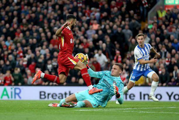 联赛杯面对利物浦,无处不在的阿丁格拉让红军很是难受,但本场率先让利物浦没脾气的,是荷兰门将费布吕亨:开场9分钟,长驱直入的努涅斯罕见地没有蛮干,而是扣球闪出角度后兜射后脚,但这记致敬萨拉赫的射门,却被荷兰人横身托出。随后,利物浦防线一次看似问题不大的拦截失误,却不幸酿成了丢球,三笘薫横扫门前,后点的卡迪奥卢不等皮球落地果断起脚抽射死角,皮球几乎是从齐米卡斯和凯莱赫之间唯一的空隙穿行,击中远端立柱入网。比起上场的持续打铁,首发回归的布莱顿,效率显然上了一个档次。