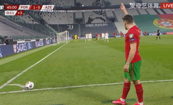 45+1'葡萄牙开出角球,鲁本·内维斯后点得球再传,C罗倒钩高出横梁!